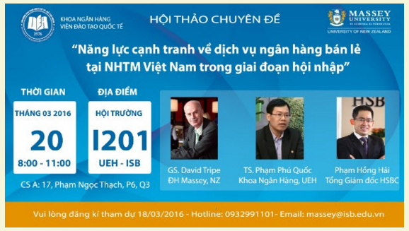Thực hiện lộ trình hội nhập kinh tế quốc tế, NHTM Việt Nam đối đầu với thách thức là sự tham gia của các tập đoàn tài chính đa quốc gia. Trước tình hình đó, các NHTM buộc phải có những cải cách, chiến lược kinh doanh. Phát triển dịch vụ ngân hàng bán lẻ là vấn đề được đặt ra hàng đầu, vì đây là thị trường tiềm năng, phát triển bền vững. Viện Đào tạo quốc tế & khoa Ngân hàng trường Đại học Kinh tế TPHCM kết hợp với trường Đại học Massey New Zealand tổ chức báo cáo chuyên đề “Năng lực cạnh tranh về dịch vụ ngân hàng bán lẻ tại các ngân hàng thương mại Việt Nam trong giai đoạn hội nhập”.